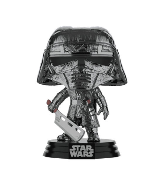 Bring home an electronic Pop! Kylo Ren, hematite chrome Pop! Knight of Ren (blaster), hematite chrome Pop! Knight of Ren (club), hematite chrome Pop! Knight of Ren (scythe), hematite chrome Pop! Knight of Ren (cannon), hematite chrome Pop! Knight of Ren (blade) and hematite chrome Pop! Knight of Ren (axe), a 10” glow in the dark Pop! Kylo Ren, Pop! Dark Rey, a metallic Pop! C-3PO™ with red eyes.
